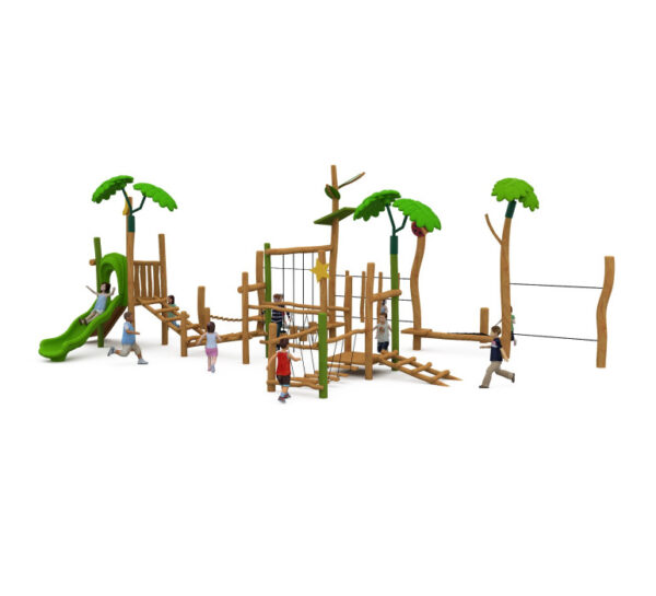 Las cuerdas de terileno de 6 hebras y diámetro de 16mm son duraderas y resistentes a la humedad y los rayos UV, lo que asegura su larga vida útil y su capacidad de mantenerse en excelentes condiciones. Los componentes de plástico están fabricados con LLDPE (polietileno de baja densidad lineal), garantizando resistencia y durabilidad. La parte de madera está elaborada con madera de Acacia o Robinia, una opción robusta y sostenible que asegura la estabilidad y seguridad del juego. Herrajes, pernos, uniones y tornillos son de metal galvanizado, para entregar una mayor vida útil y resistencia al clima.