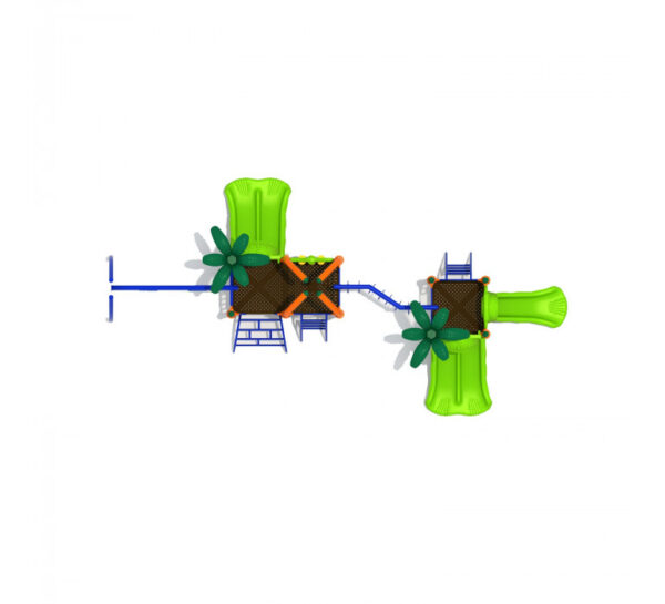 Compuesto de una estructura principal de acero galvanizado de 114 mm de diámetro y 2 mm de espesor. La tubería secundaria tiene un diámetro 28 mm y 2 mm de espesor. Tanto los toboganes y figuras están fabricados en polipropileno de baja densidad resistentes a rayos UV y al alto tráfico. El acabado de pintura tiene un tratamiento al horno sellado electrostáticamente logrando un producto final hecho para durar.